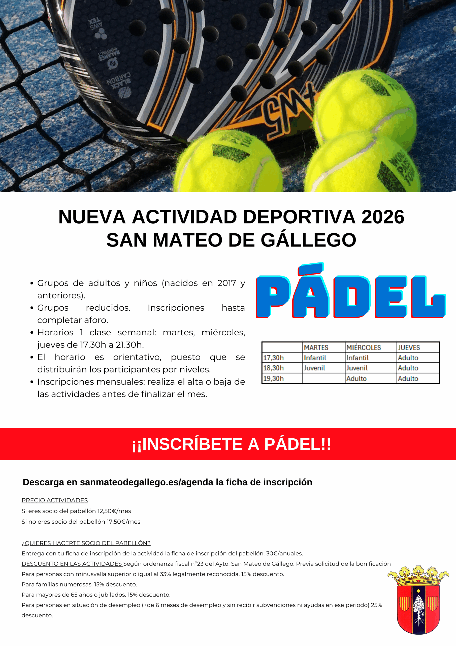 02Feb2026 Clases de pádelEn enero comienza una nueva actividad deportiva en San Mateo para niños y mayores: PÁDEL. Si estás interesad@ en participar, inscríbete en el Ayuntamiento. Ficha de inscripción Domiciliación Los grupo son reducidos y se organizarán según el nivel de los participantes.