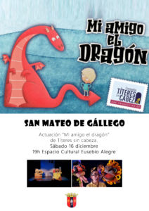 16Dic2023 TíteresDesde 19.00hLugar: Espacio Cultural Eusebio Alegre (ECEA)Actuación de Títeres sin cabeza con su actuación "Mi amigo el Dragón". Sábado 16 de diciembre en el Espacio cultural Eusebio Alegre de San Mateo de Gállego. Ver cartel