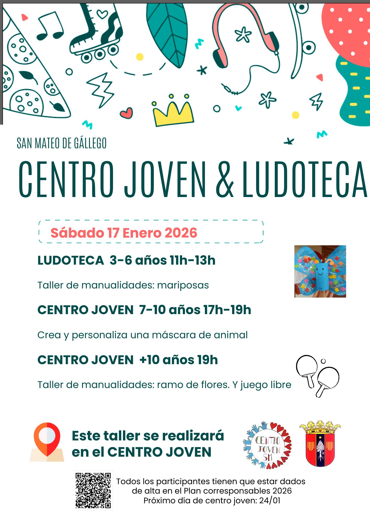 El centro joven empieza el nuevo año este sábado 10 de enero, en el cartel aparecen los días de apertura de enero y febrero, ¡os esperamos!
