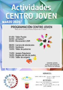 01Mar2024 Lugar: Centro jovenProgramación actividades marzo 2024 en el Centro Joven de San Mateo de Gállego Ver cartel