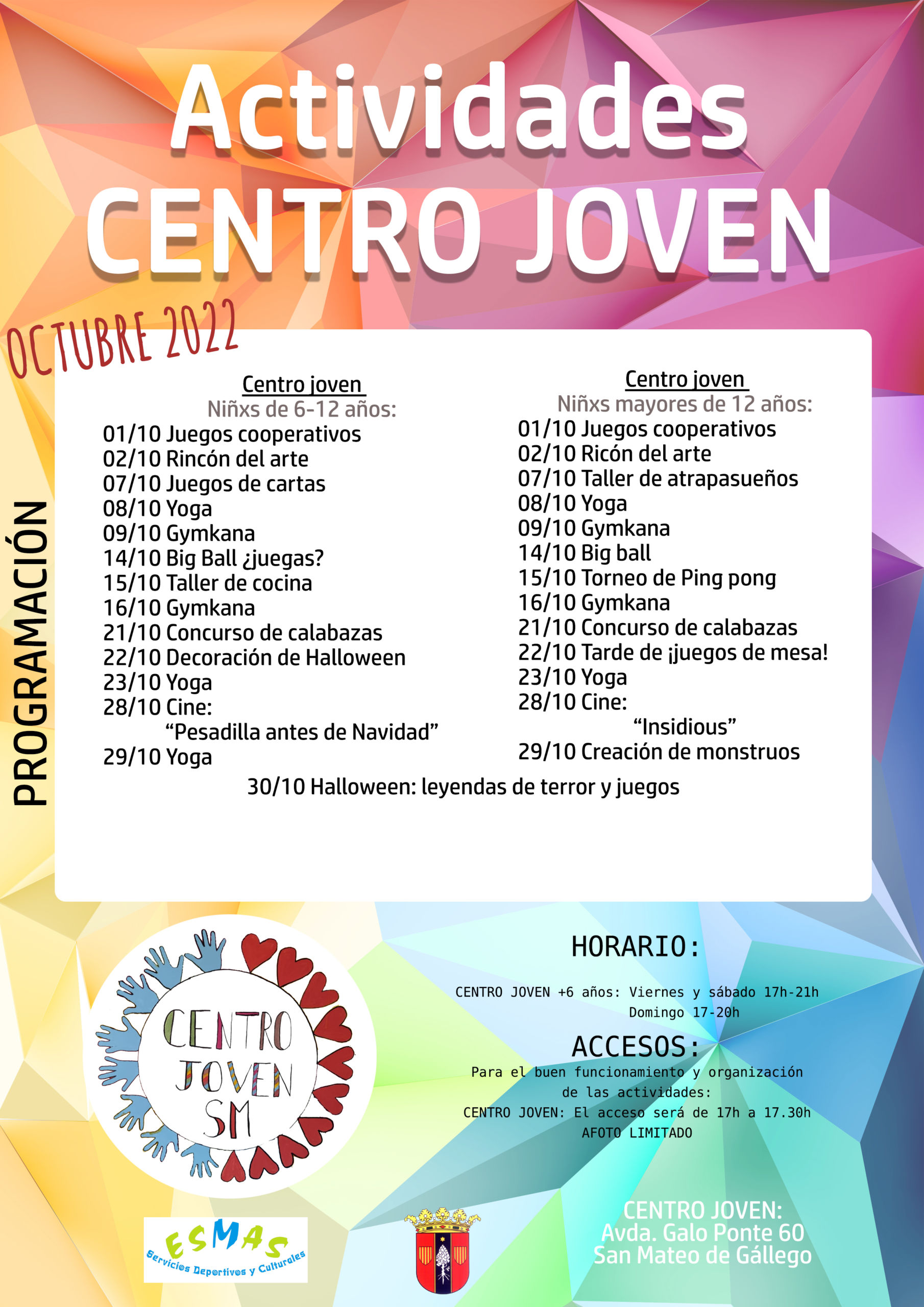 01Oct202230Oct2022 Centro Joven Octubre 2022Lugar: Centro jovenCalendario de actividades en el Centro Joven durante el mes de octubre 2022 en San Mateo de Gállego Ver Cartel