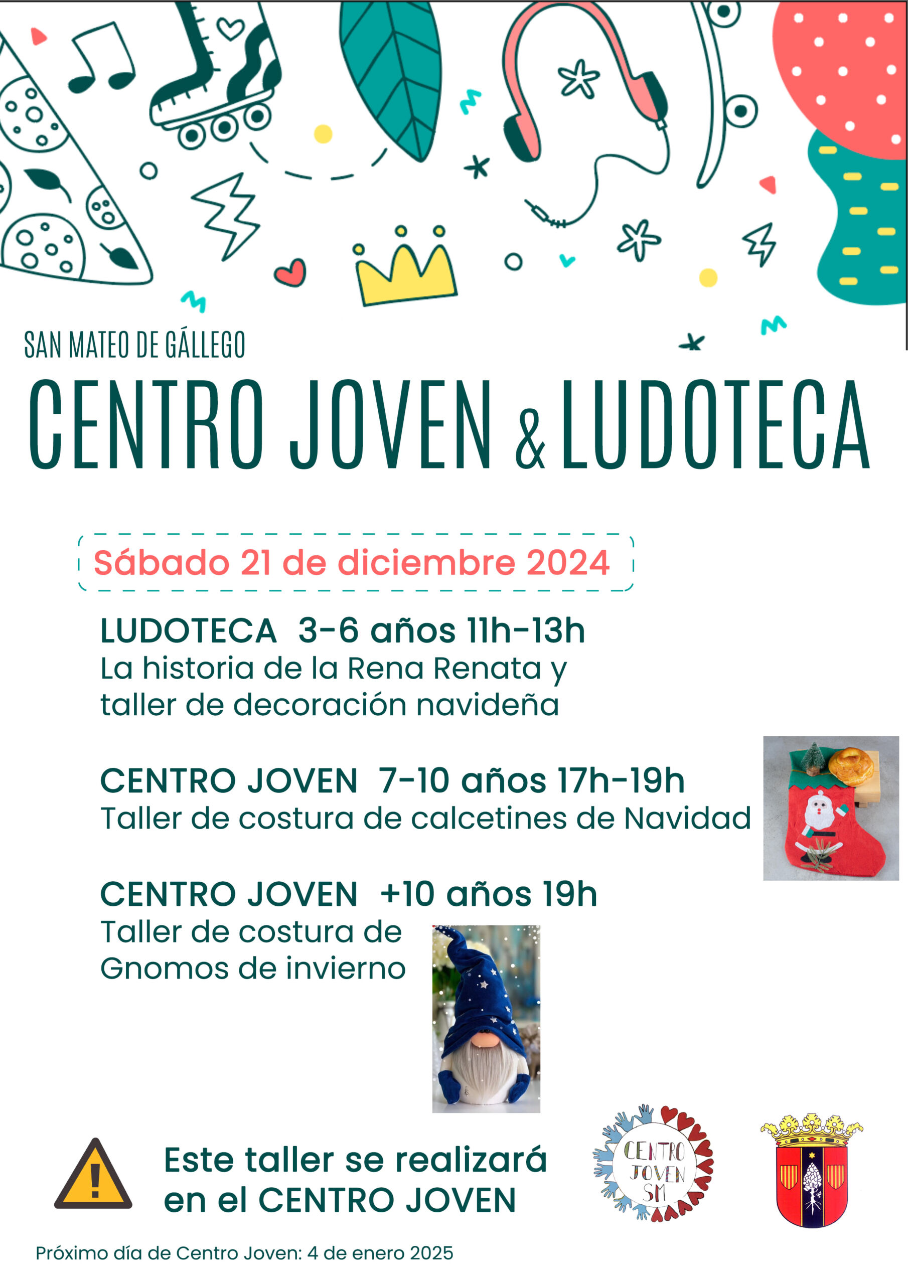 Actividades de ludoteca y centro joven para el sábado 21 de diciembre 2024. Las actividades se realizarán en el centro joven.