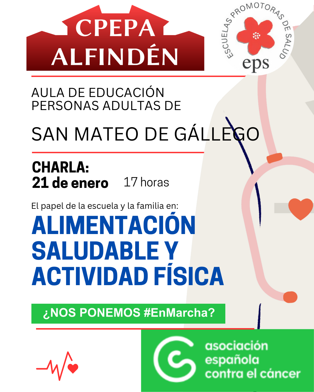 21Ene2026 Desde 17hLugar: Escuela de adultos SMDGA las 17h tendrá lugar una charla sobre la alimentación y la actividad física. Se realizará en el aula de personas adultas situado en Av. Galo Ponte 60. Entrada gratuita