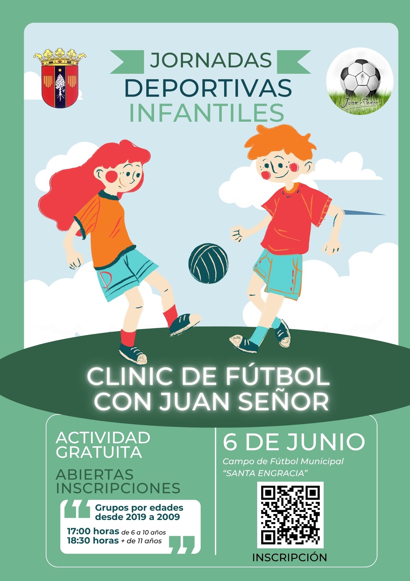 06Jun2025 Desde 17hLugar: Campo de fútbolgratuitoJornadas deportivas infantiles para niños y niñas de 2009-2019. Clínic de fútbol gratuito con Juan Señor viernes 6 de junio Inscripciones abiertas hasta completarse el aforo. Enlace para inscripciones Ver cartel