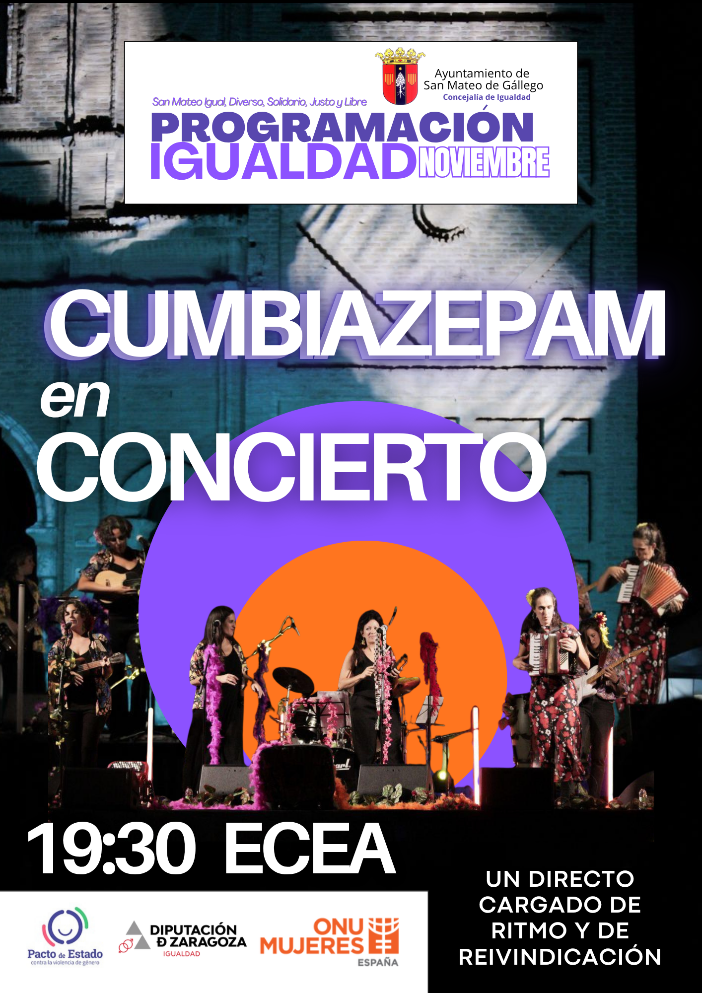 El próximo 22 de noviembre dentro de la programación de igualdad de noviembre de 2025, tendrá lugar el concierto de Cumbiazepan en el ECEA en San Mateo de Gállego.