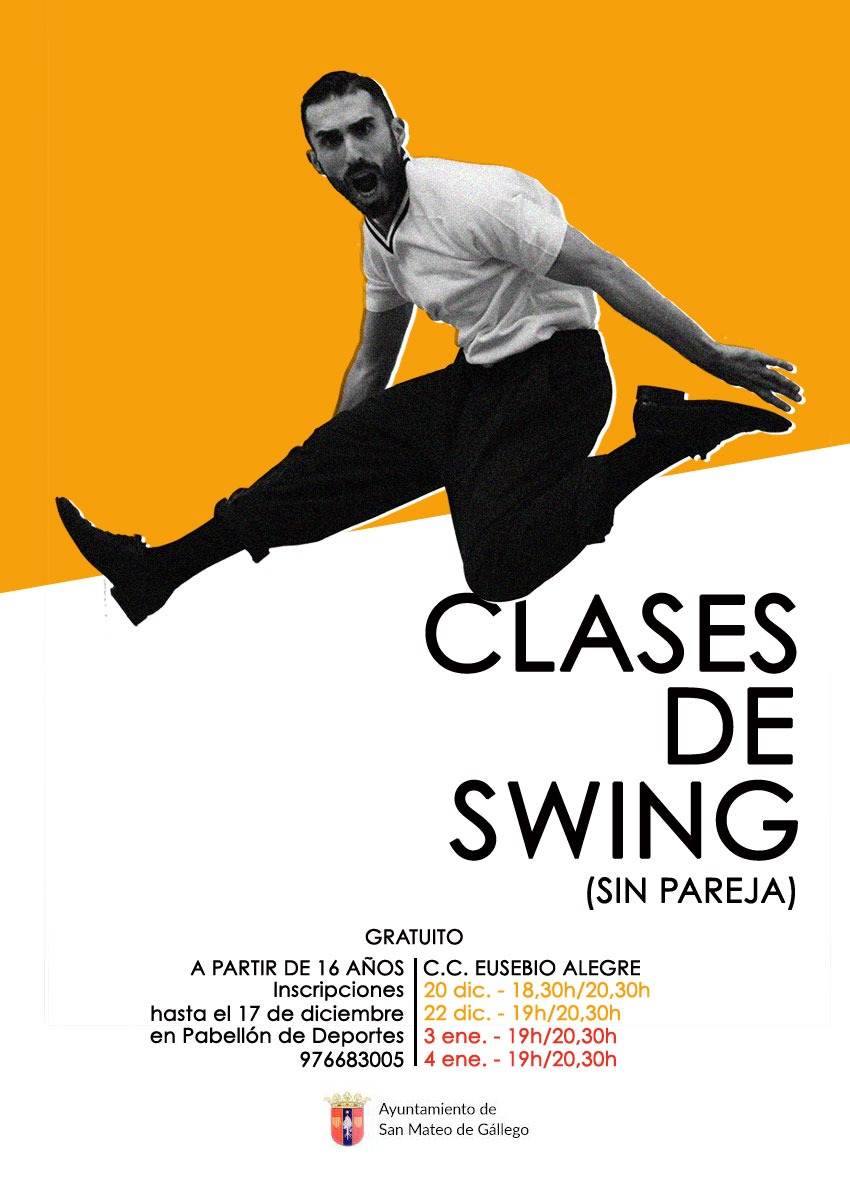 20Dic202104Ene2022 Curso de SwingLugar: Espacio Cultural Eusebio AlegreAyto San Mateo de GállegoCurso de Swing en San Mateo de Gállego. Imprescindible inscripción previa. No es necesario apuntarse en pareja. Límite de plazas Ver cartel