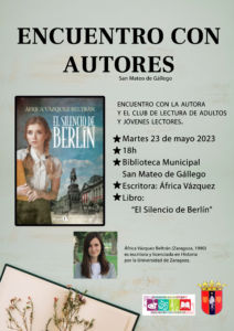 23May2023 Encuentro con autoresDesde 18.00hLugar: Biblioteca municipal San Mateo de GállegoEncuentro con África Vázquez y el club de lectura de adultos y jóvenes lectores. Próximo martes 23 de mayo a las 18h en la Biblioteca Municipal de San Mateo de Gállego