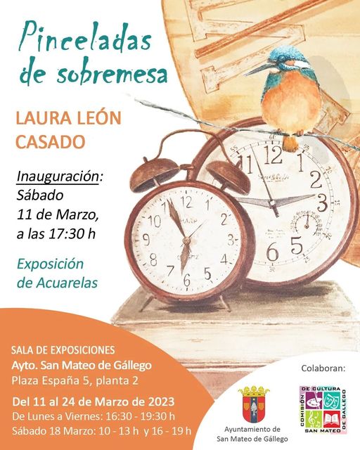 11Mar2023 Pinceladas de sobremesaDesde 17.30hLugar: Sala de exposiciones - Ayto. San Mateo de GállegoInauguración exposición de acuarelas de Laura León "Pinceladas de Sobremesa". Sábado 11 de marzo 2023 17.30h en la Sala de Exposiciones del Ayuntamiento. Ver cartel