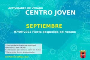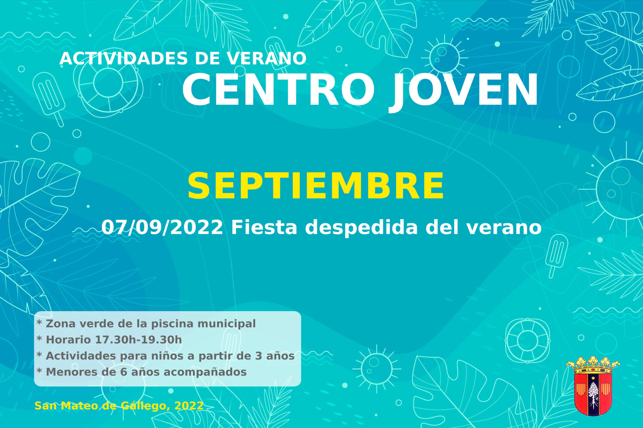 07Sep2022 Centro joven de veranoDesde 17.30hLugar: Piscinas de San MateoTerminan las actividades del centro joven en la piscina con la actividad "Fiesta despedida del verano" el miércoles 7 de septiembre. A partir del 16 de septiembre, el centro joven recuperará su espacio y horario habitual.