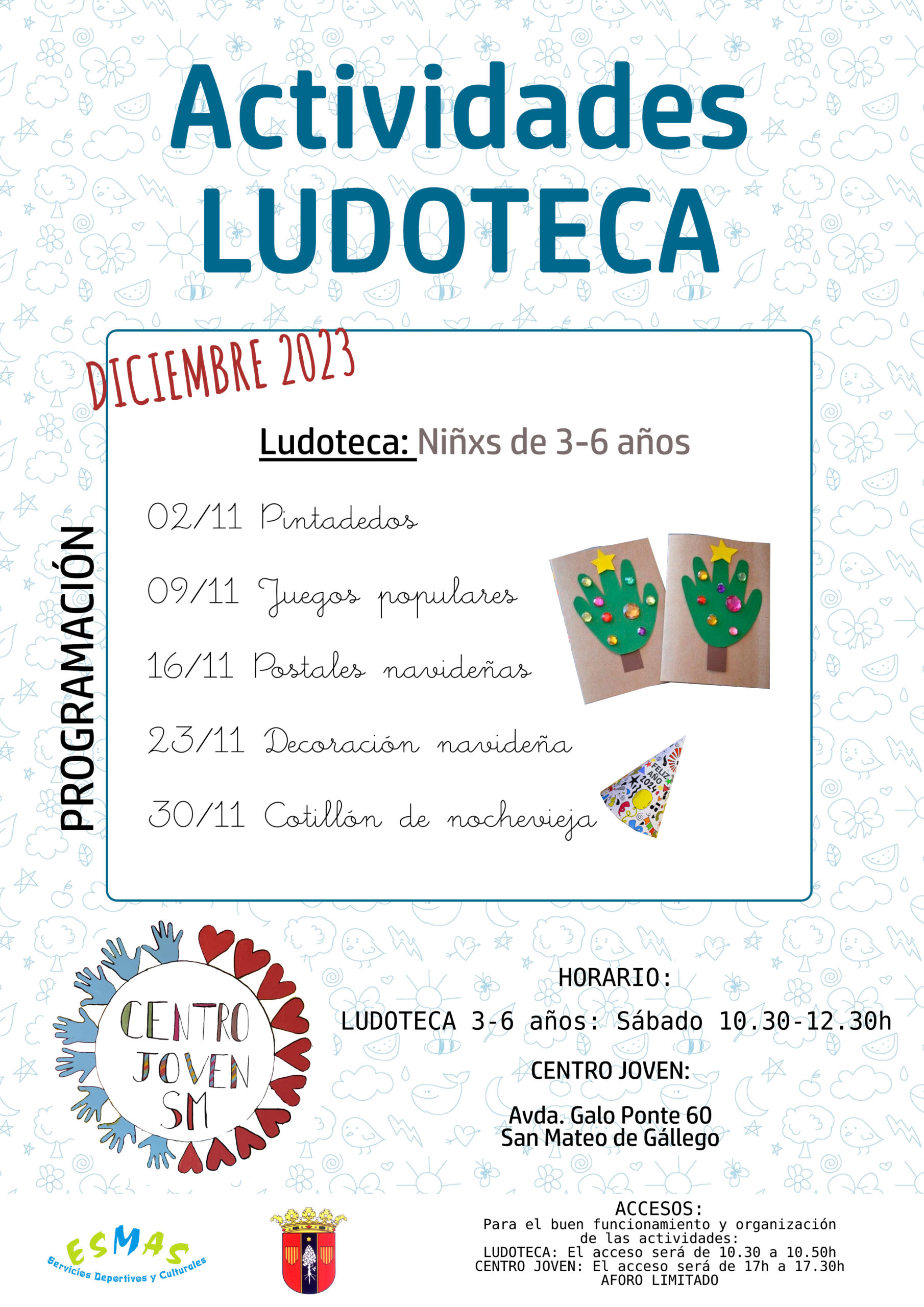 02Dic202330Dic2023 Ludoteca sábados diciembre 2023Desde 10.20hLugar: Centro jovenGratuitoProgramación de sábados de diciembre en la ludoteca de San Mateo de Gállego. Ver cartel