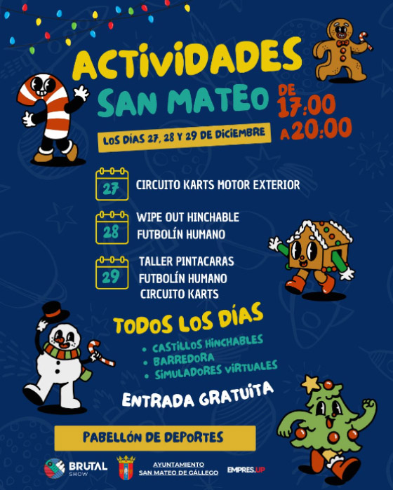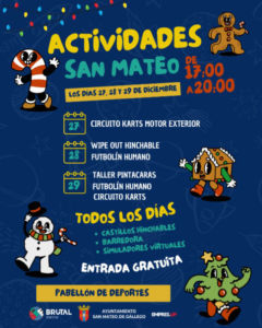 27Dic202329Dic2023 Desde 17.00h hasta 20.00hLugar: Pabellón de DeportesGratuitoDurante los días 27, 28 y 29 de diciembre habrá animación con hinchables, simuladores... en el pabellón de deportes de San Mateo de Gállego. Ver cartel.