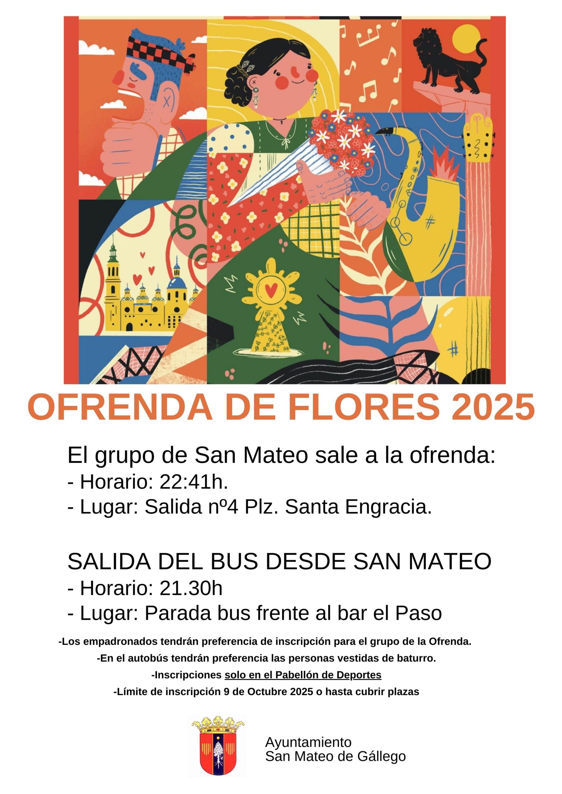 El grupo de San Mateo de Gállego participará en la Ofrenda de Flores 2025 saliendo de Plz. Santa Engracia (salida 4) a las 22.41h.