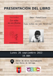 26Sep2022 Presentación libroLugar: Salón de Actos Omar Fonollosa presenta su nuevo libro de poemas "Los niños no ven féretros", el próximo 26 de septiembre en San Mateo de Gállego a las 19h en el Salón de actos. Ver cartel