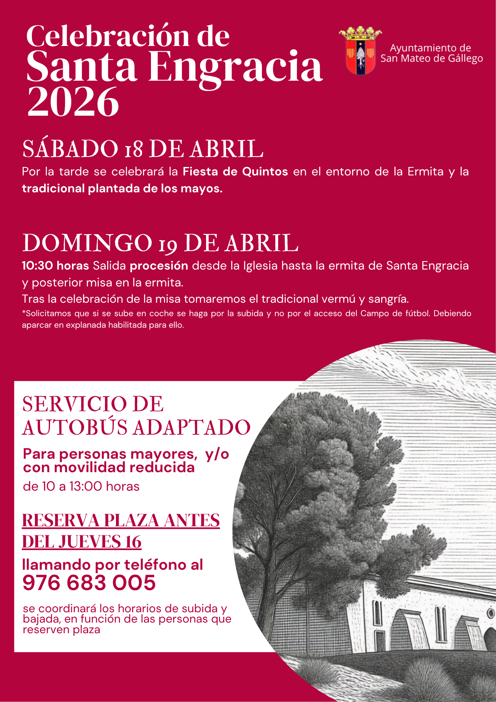 domingo 19 de abril 10:30 horas Salida procesión desde la Iglesia hasta la ermita de Santa Engracia y posterior misa en la ermita. Tras la celebración de la misa tomaremos el tradicional vermú y sangría.