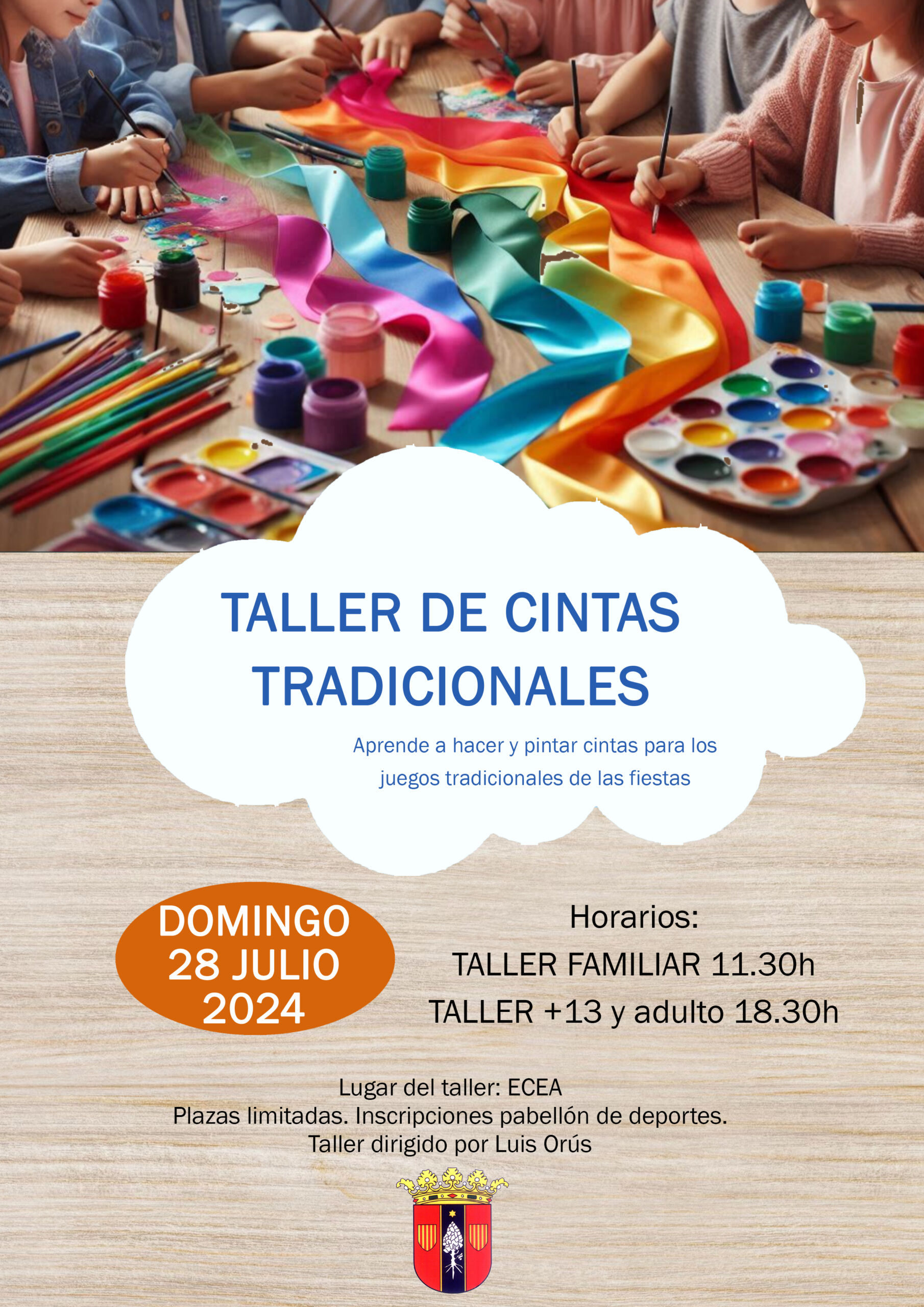 28Jul2024 Lugar: Espacio Cultural Eusebio Alegre (ECEA)Taller de cintas tradicionales en el ECEA. Dos horarios por edades, para aprender a hacer las tradicionales cintas de los juegos populares de las fiestas de agosto. Ver cartel